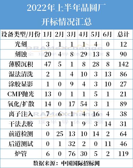 從開標(biāo)數(shù)據(jù)看,2022 年上半年國內(nèi)主要晶圓廠共開標(biāo)765臺(tái)工藝設(shè)備,其中清洗設(shè)備86臺(tái),數(shù)量排名第五。
