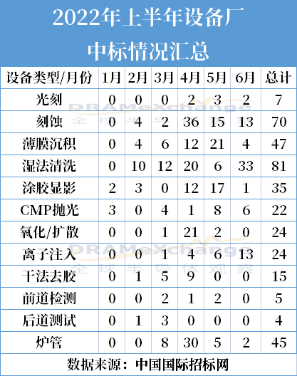 而結(jié)合中標(biāo)數(shù)據(jù)看,2022 年上半年國(guó)內(nèi)主要設(shè)備廠共中標(biāo)379臺(tái)工藝設(shè)備,濕法清洗設(shè)備81臺(tái),數(shù)量排名第一,中標(biāo)較多廠商為北方華創(chuàng)、中微公司、拓荊科技、芯源微、盛美上海等。