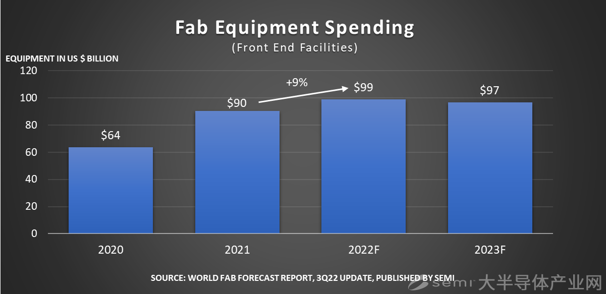 美國加州時(shí)間2022年9月27日,SEMI在其最新的季度《世界晶圓廠預(yù)測報(bào)告》(World Fab Forecast)中宣布,2022年全球晶圓廠設(shè)備支出預(yù)計(jì)將同比增長約9%,達(dá)到990億美元的歷史新高。